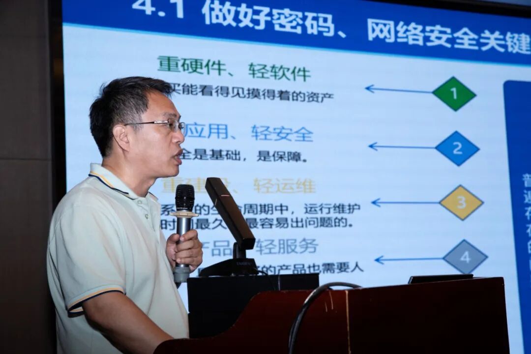 杜育新在致辞中表示,本次推进会是一次培训学习会,通过各位专家讲解,进一步提高大家对密码与网络安全以及密评工作重要性的认识;是一次经验交流会,共同交流商用密码应用方案,促进密码测评规范开展;更是一次工作推进会,通过会议成功举办,有力促进密码应用安全性评估工作高质量发展,切实提升全市网络安全防范水平。希望各单位以这次会议为契机,认真落实上级要求,加强对网络与信息系统建设项目、已建成项目密码应用情况的监督管理,进一步推进密码应用与安全性评估工作,确保密码技术、产品和服务合规、正确、有效应用。